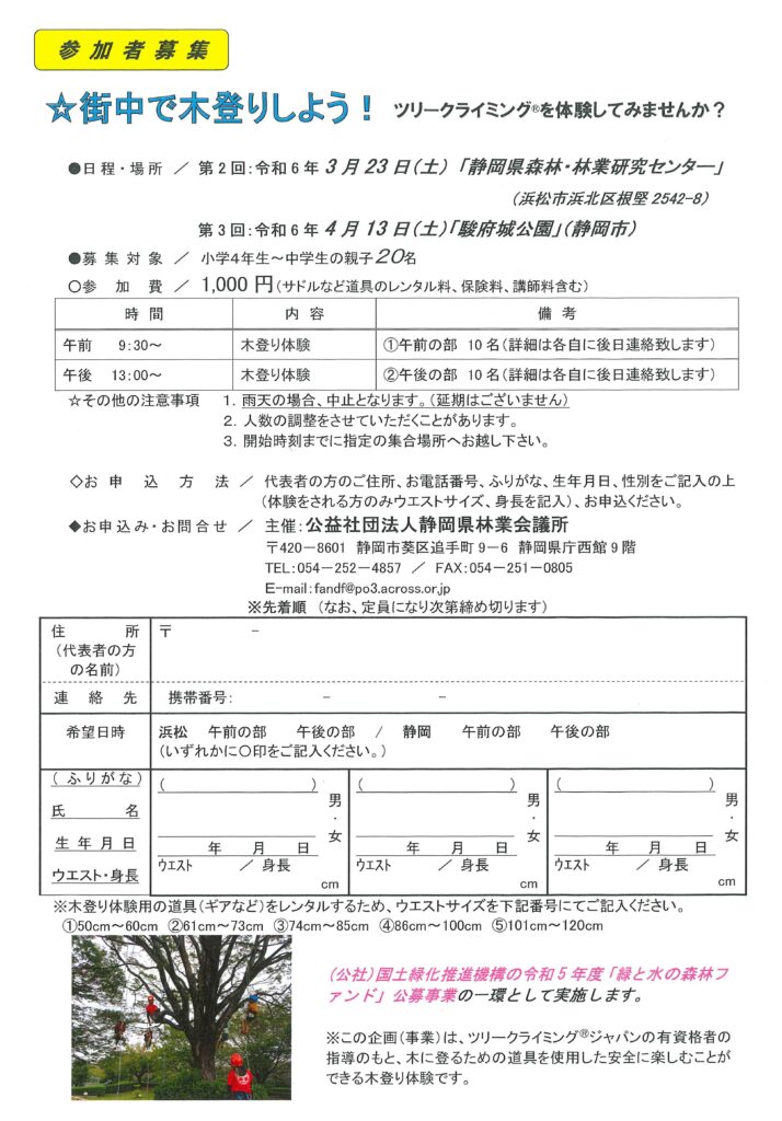 「街中ツリークライミング」参加者募集のお知らせ